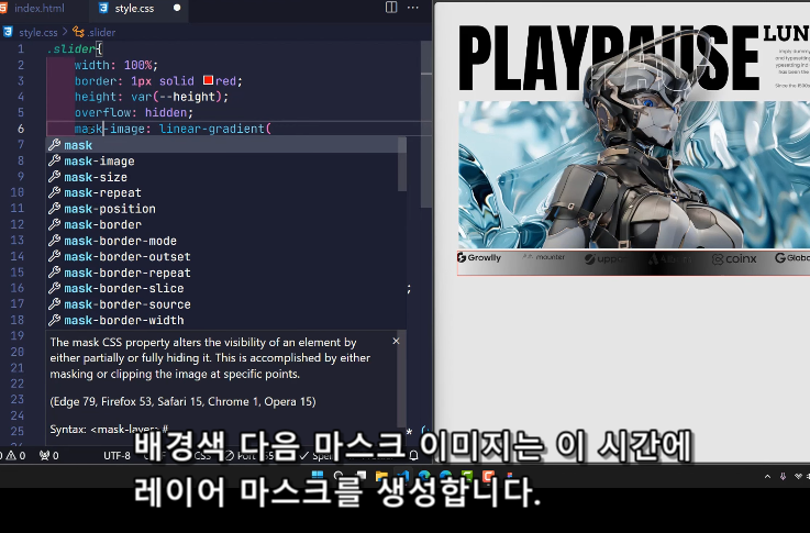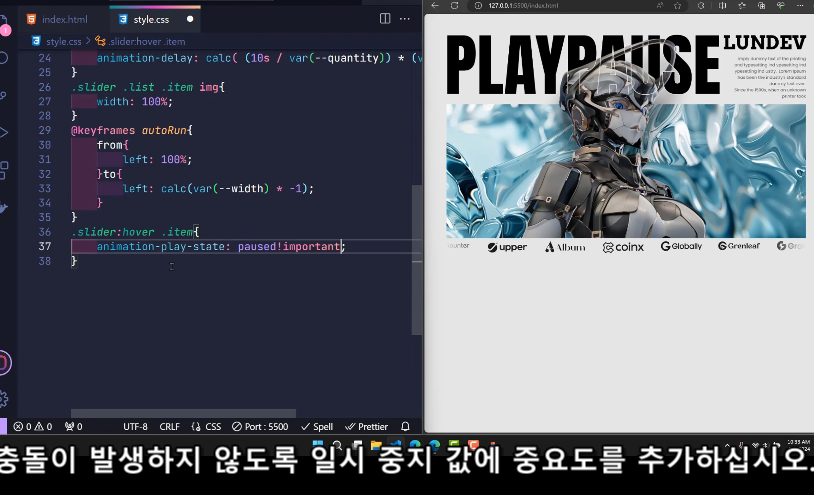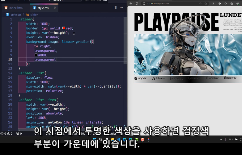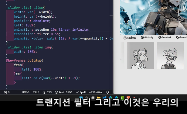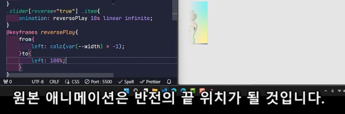- var(--quantity): 슬라이더 아이템의 총 개수입니다. 여기서는 10으로 설정되어 있습니다.